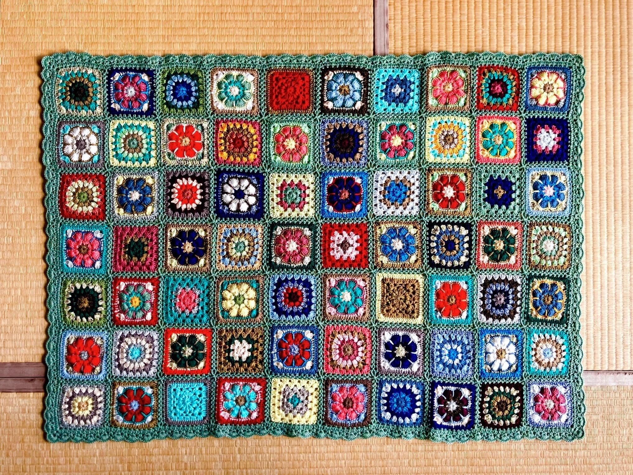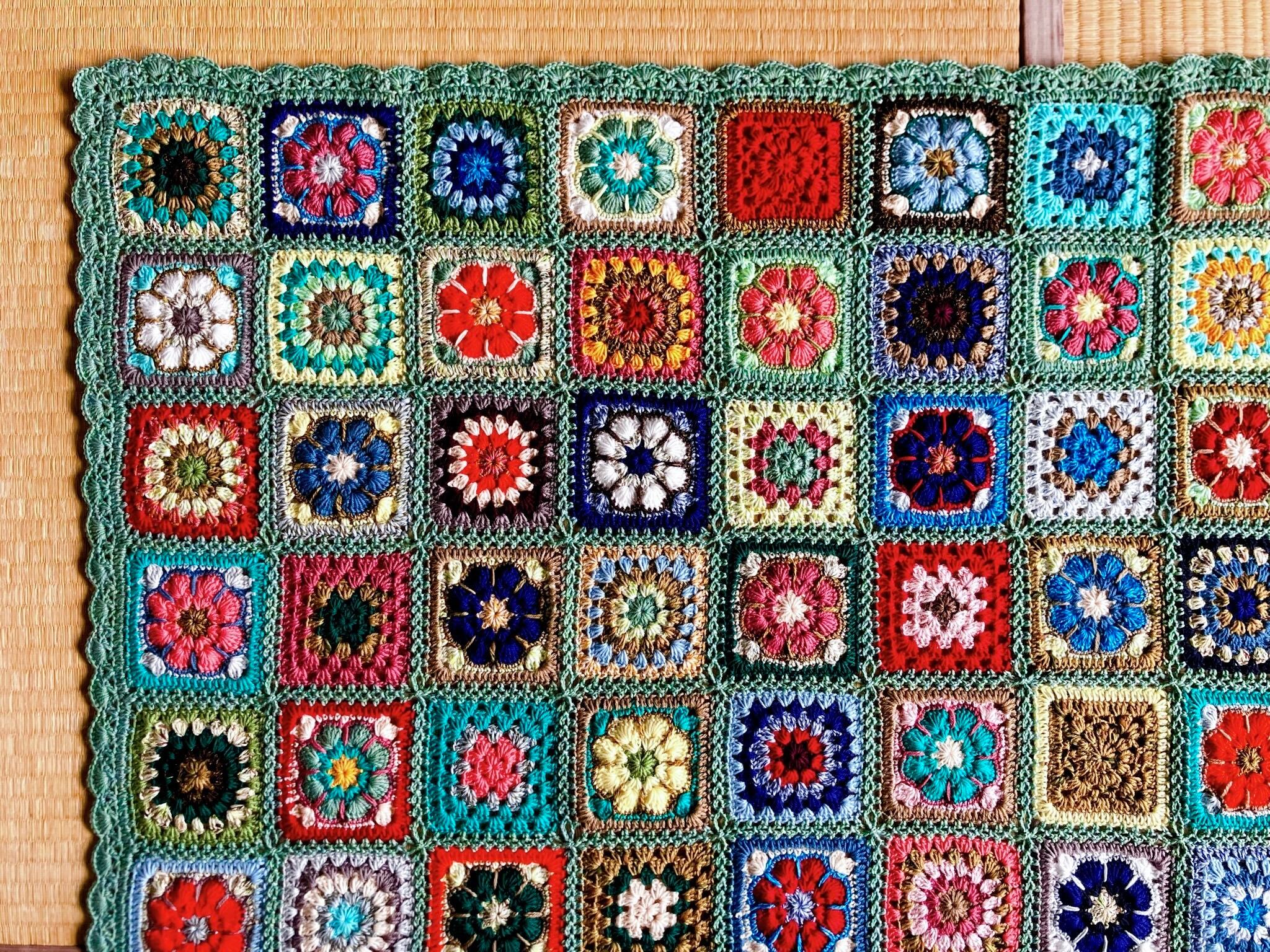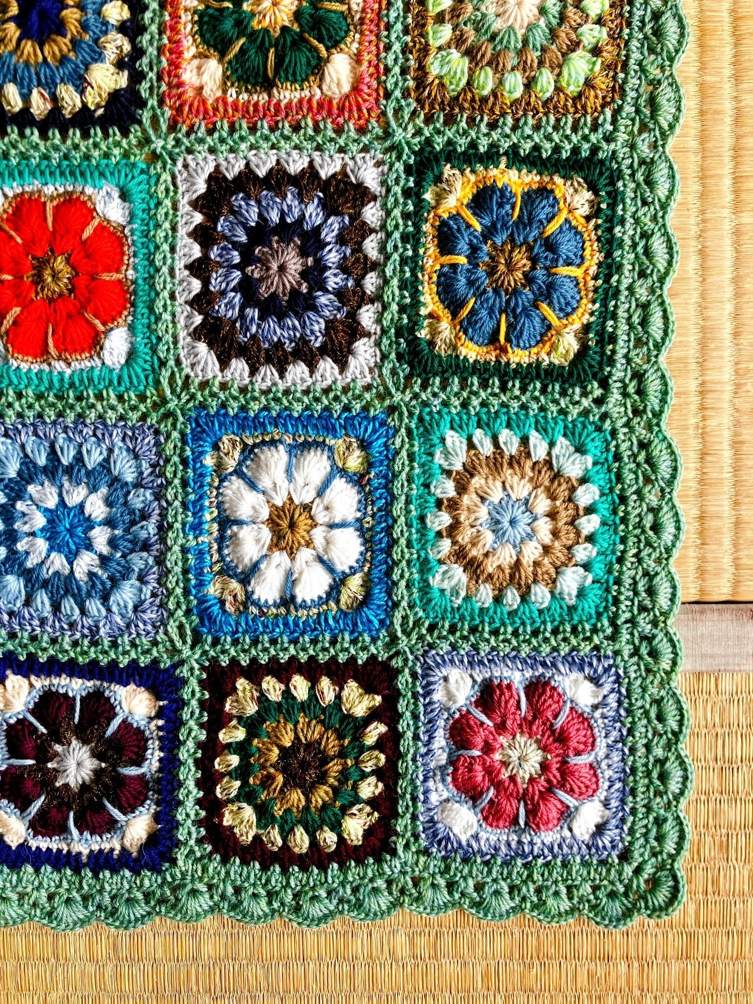カラフルな4種類のモチーフ(アフリカンフラワー、グラニースクエア、グラニースクエアを変化させたグラデーション模様、単色の花模様)をユーカリグリーンの毛糸で繋ぎました。