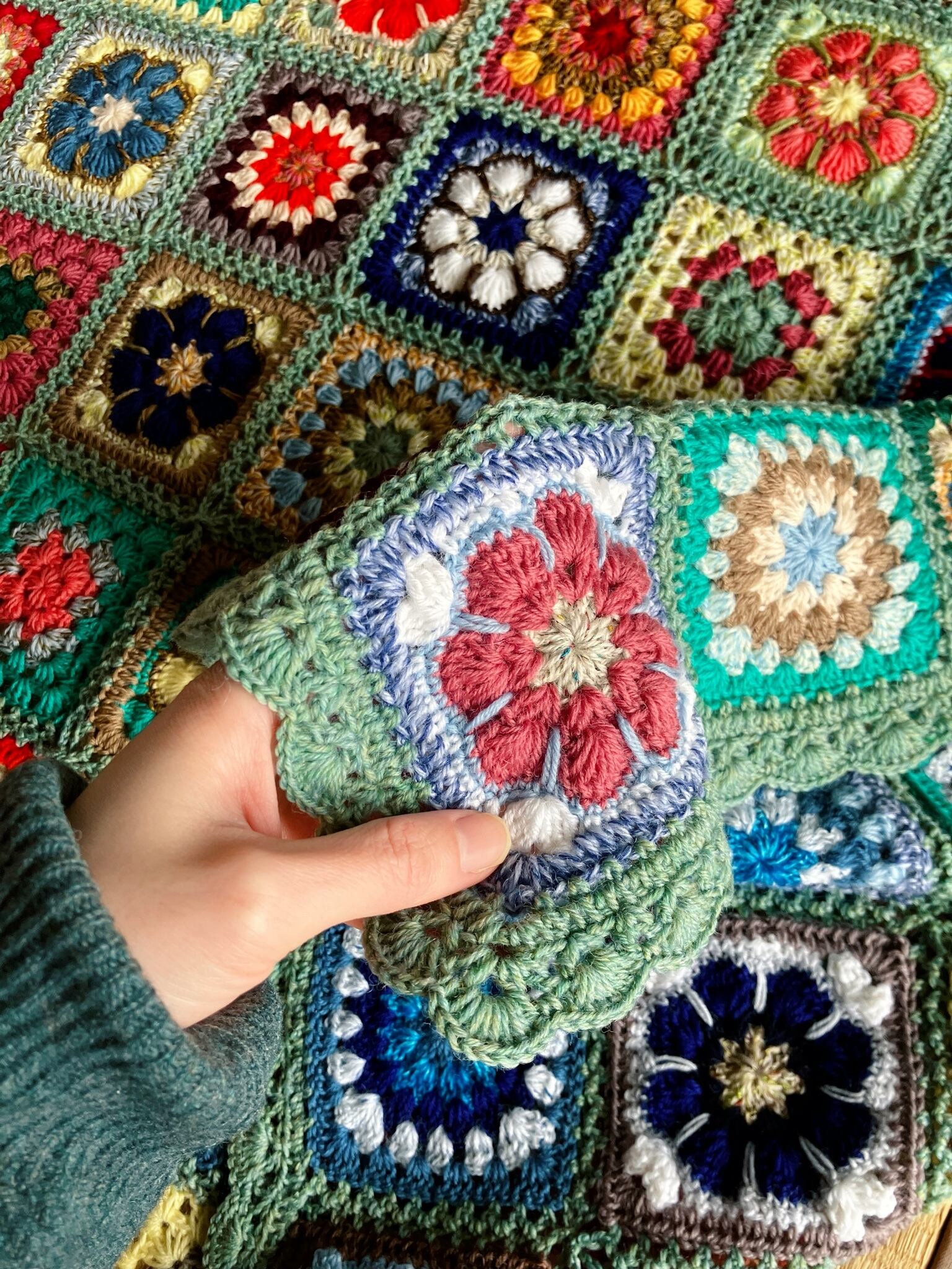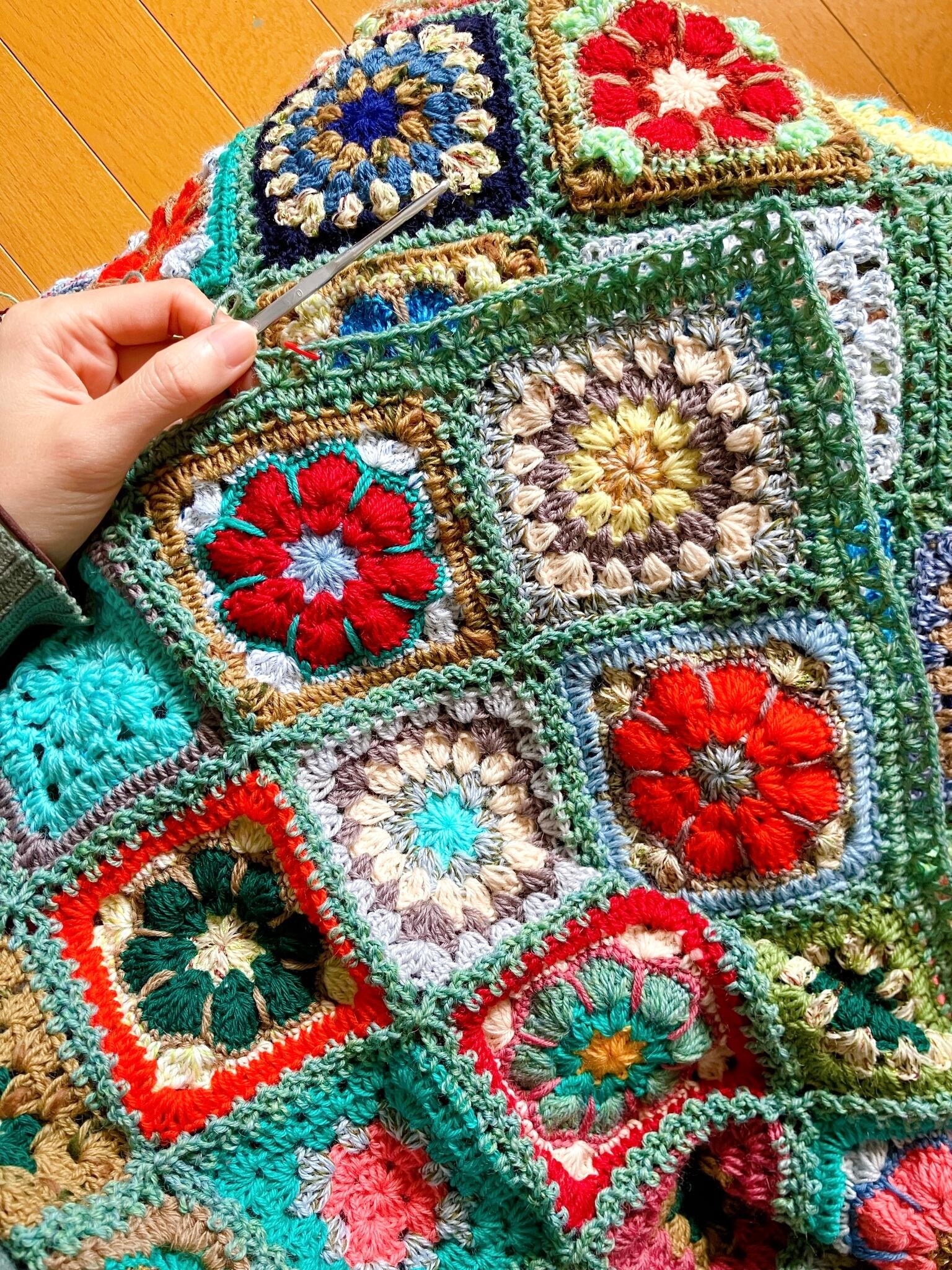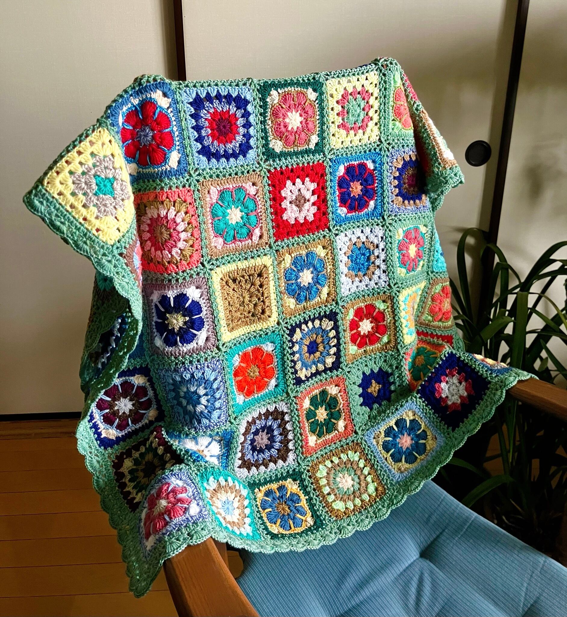 カラフルな4種類のモチーフ(アフリカンフラワー、グラニースクエア、グラニースクエアを変化させたグラデーション模様、単色の花模様)をユーカリグリーンの毛糸で繋ぎました。