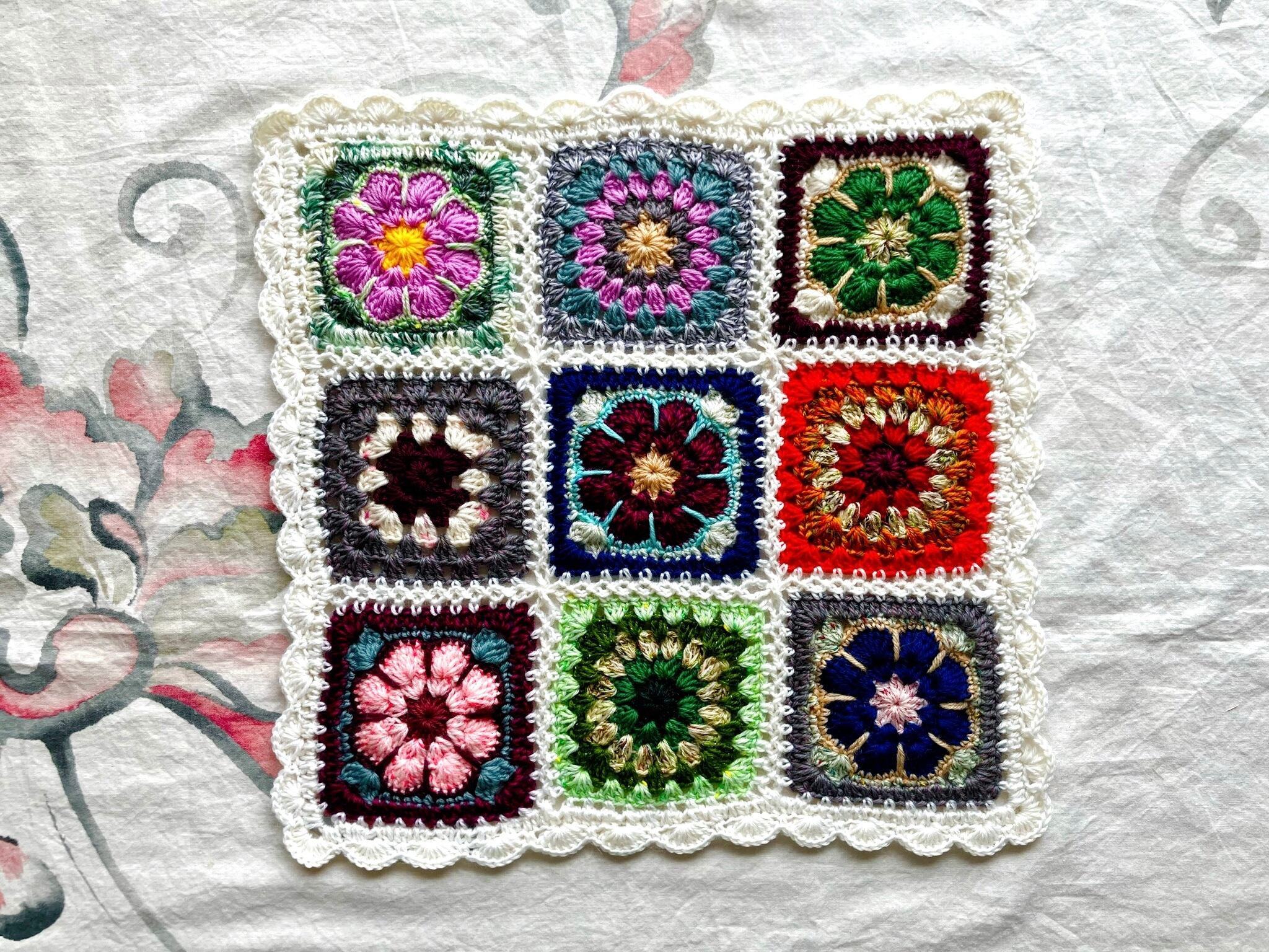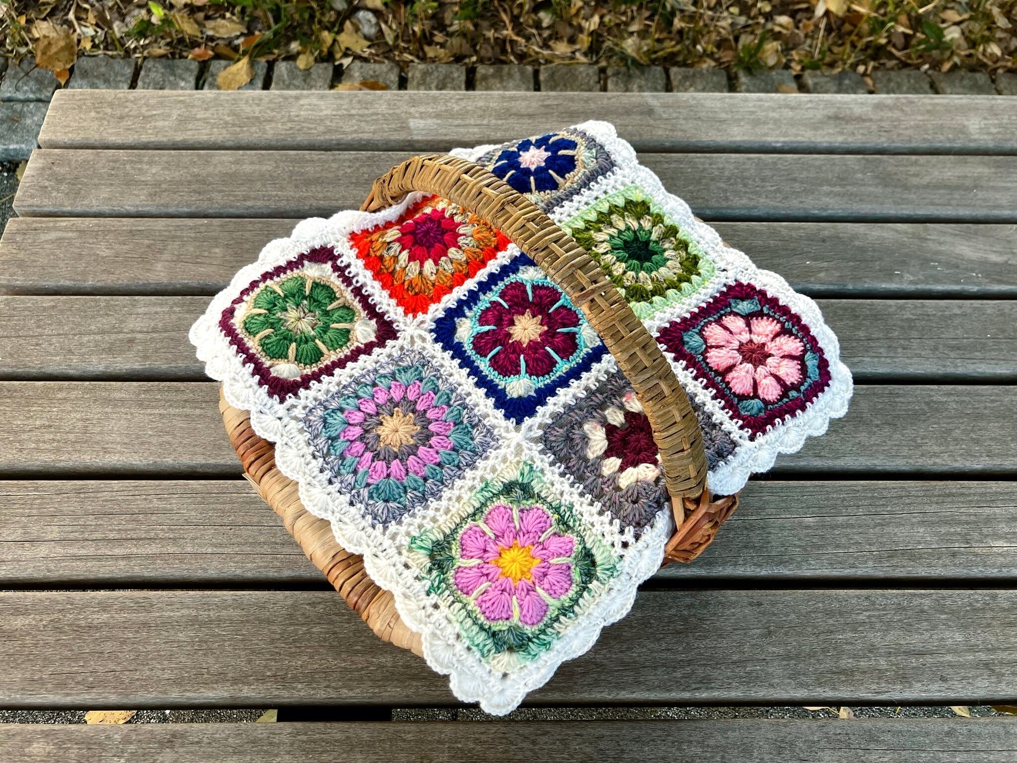 同じ物は二つとして存在しない、すべて違う色のモチーフを組み合わせて編み上げた一点ものになります。