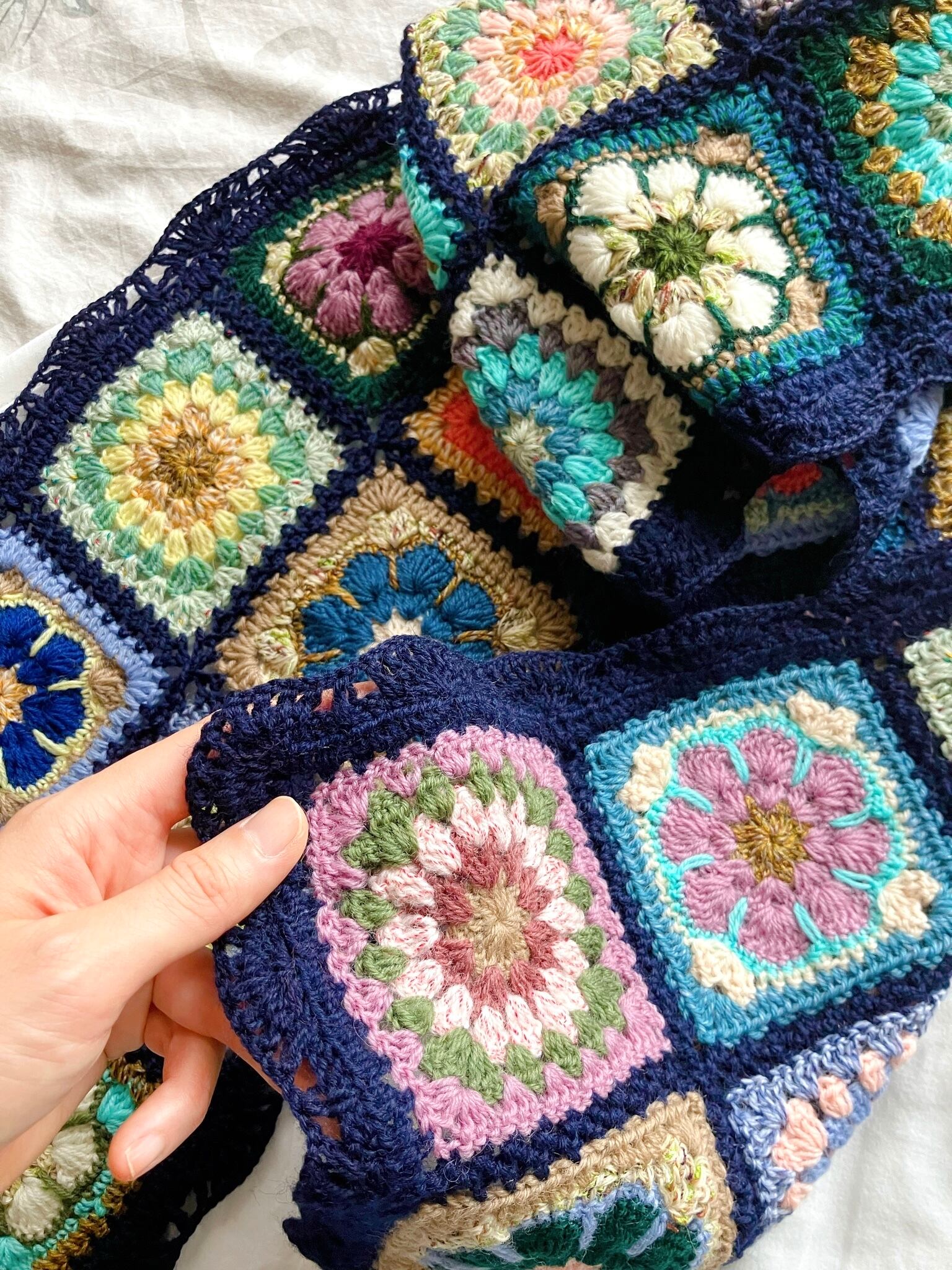 カラフルなモチーフを濃紺の毛糸で繋ぎました。中細ウールで編み上げているのでふわっと軽く、秋から春先まで首元を包み込み寒さから守ってくれます。