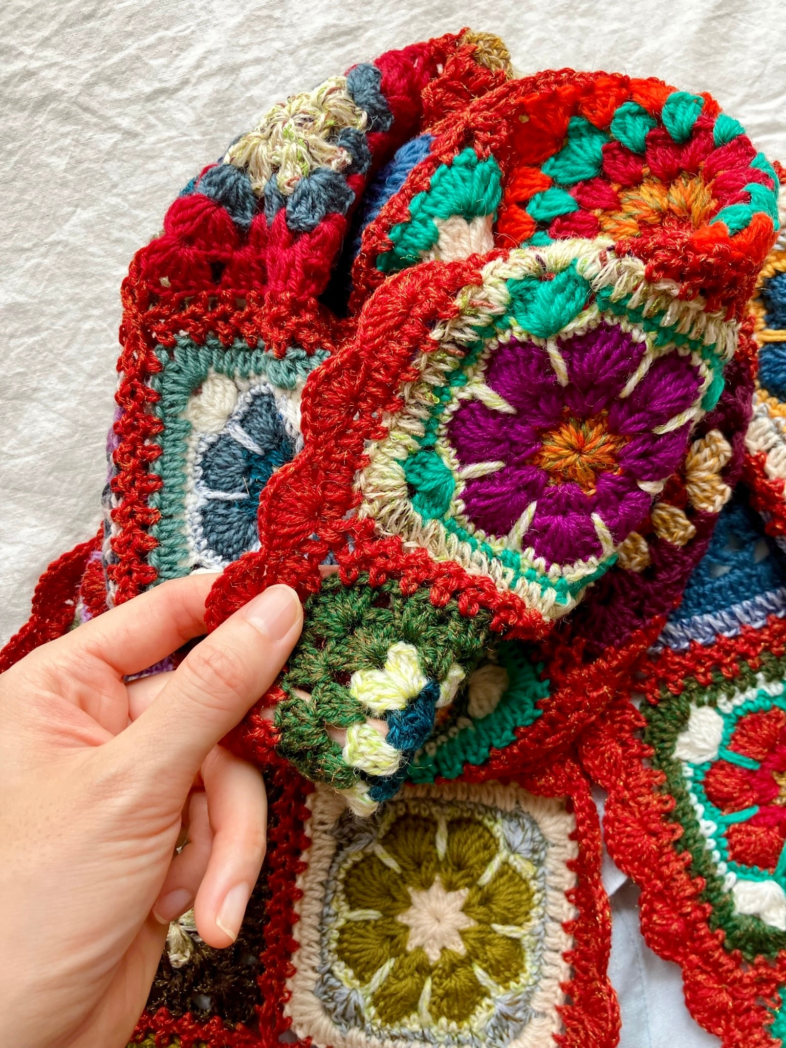 カラフルなモチーフをゴールド混じりの煉瓦色の毛糸で繋ぎました。中細ウールで編み上げているのでふわっと軽く、秋から春先まで首元を包み込み寒さから守ってくれます。
