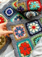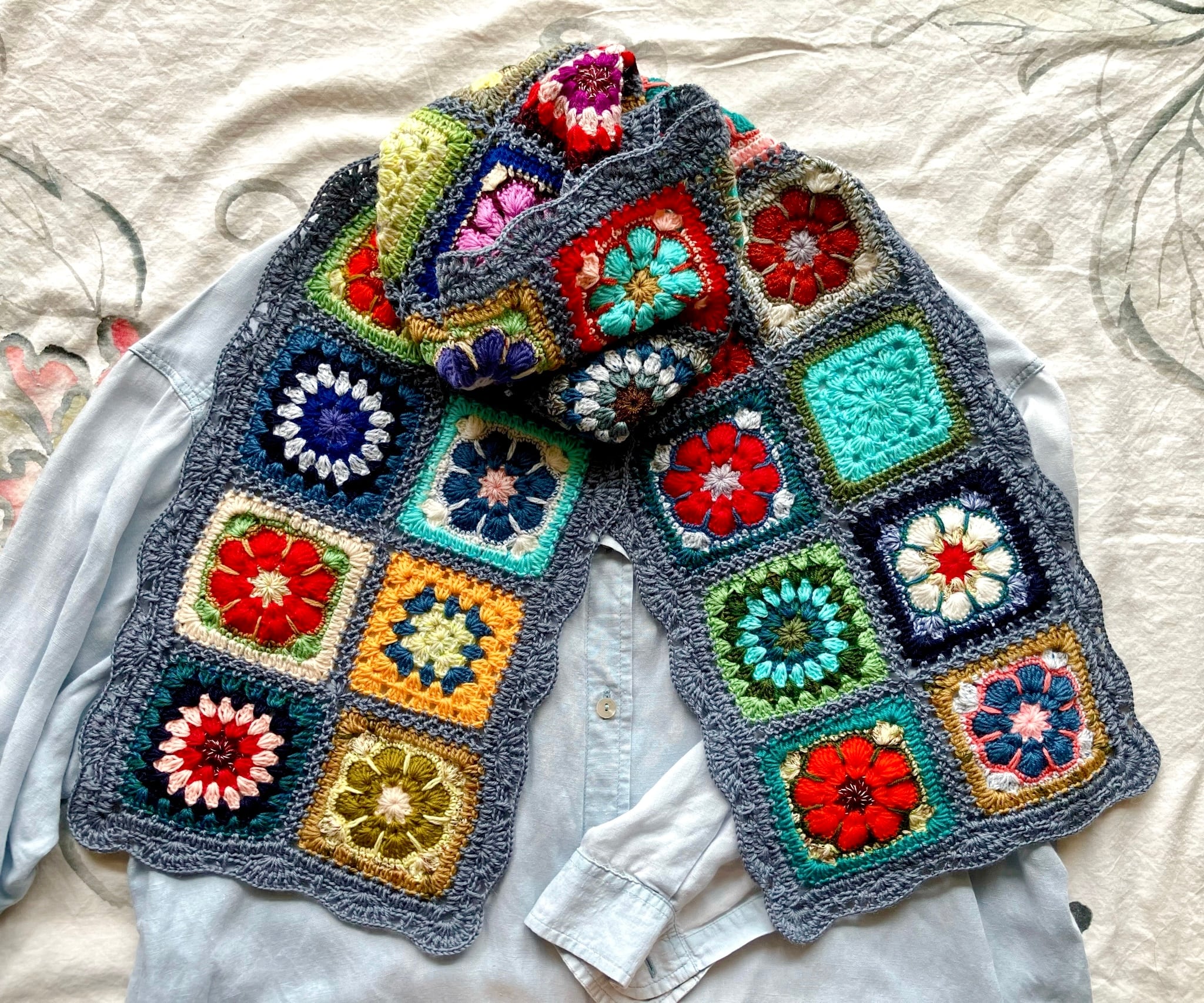 カラフルなモチーフをブルーグレーの毛糸で繋ぎました。中細ウールで編み上げているのでふわっと軽く、秋から春先まで首元を包み込み寒さから守ってくれます。