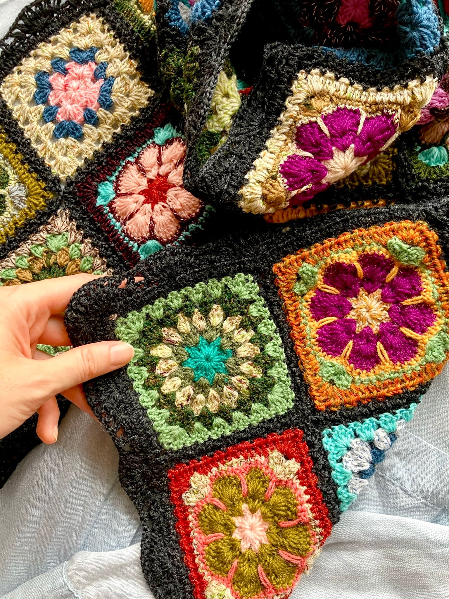 カラフルなモチーフを黒近いグレーの墨色毛糸で繋ぎました。中細ウールで編み上げているのでふわっと軽く、秋から春先まで首元を包み込み寒さから守ってくれます。