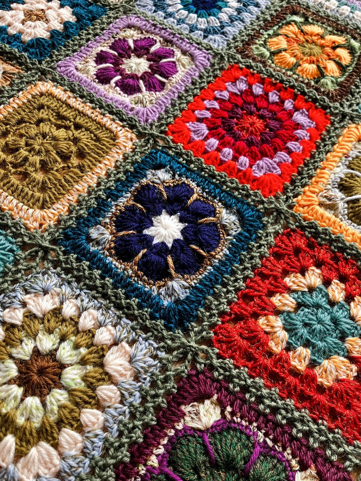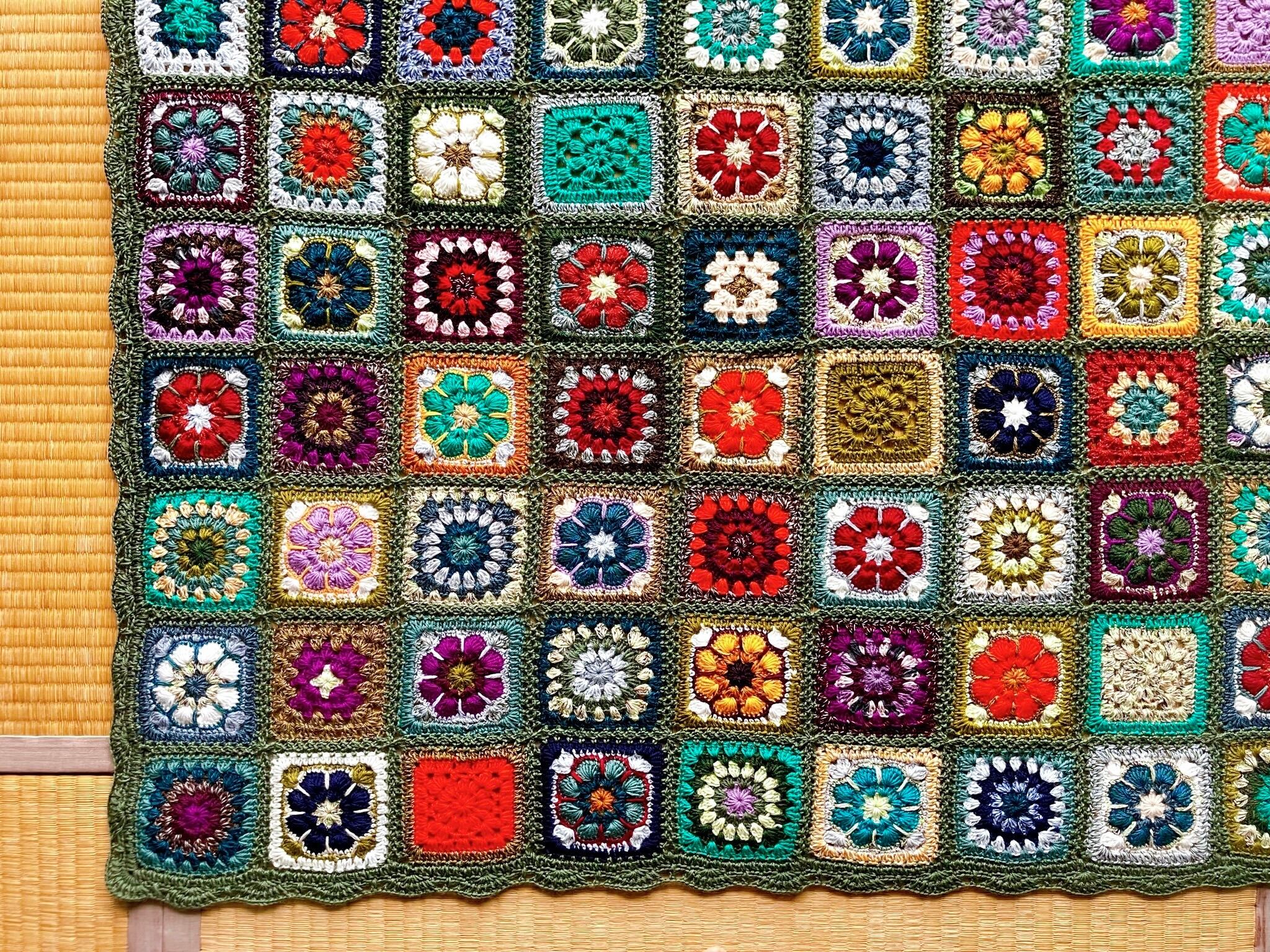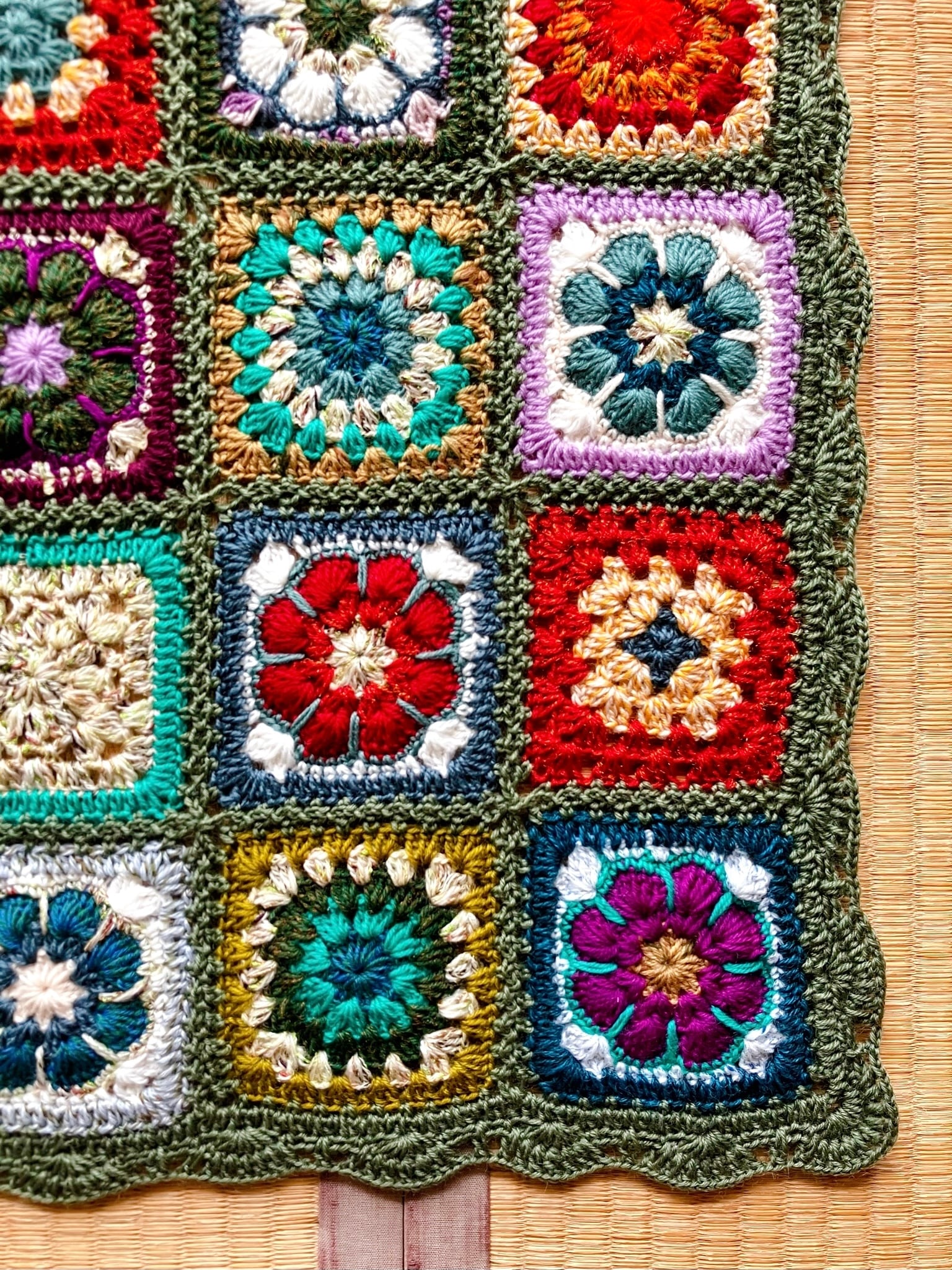 カラフルな4種類のモチーフ(アフリカンフラワー、グラニースクエア、グラニースクエアを変化させたグラデーション模様、単色の花模様)をセージグリーンの毛糸で繋ぎました。