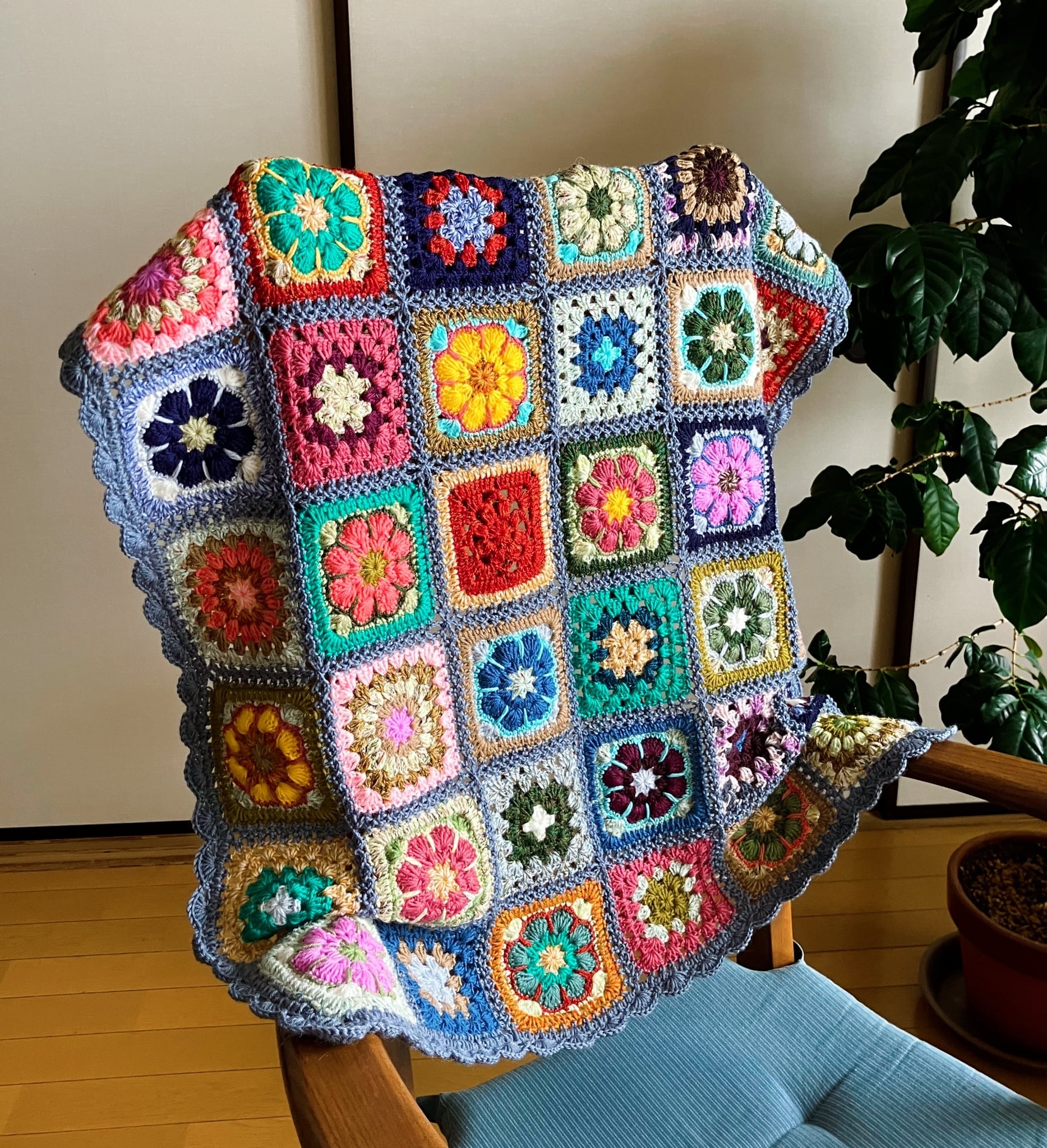 カラフルな4種類のモチーフ(アフリカンフラワー、グラニースクエア、グラニースクエアを変化させたグラデーション模様、単色の花模様)をくすんだブルーグレーの毛糸で繋ぎました。