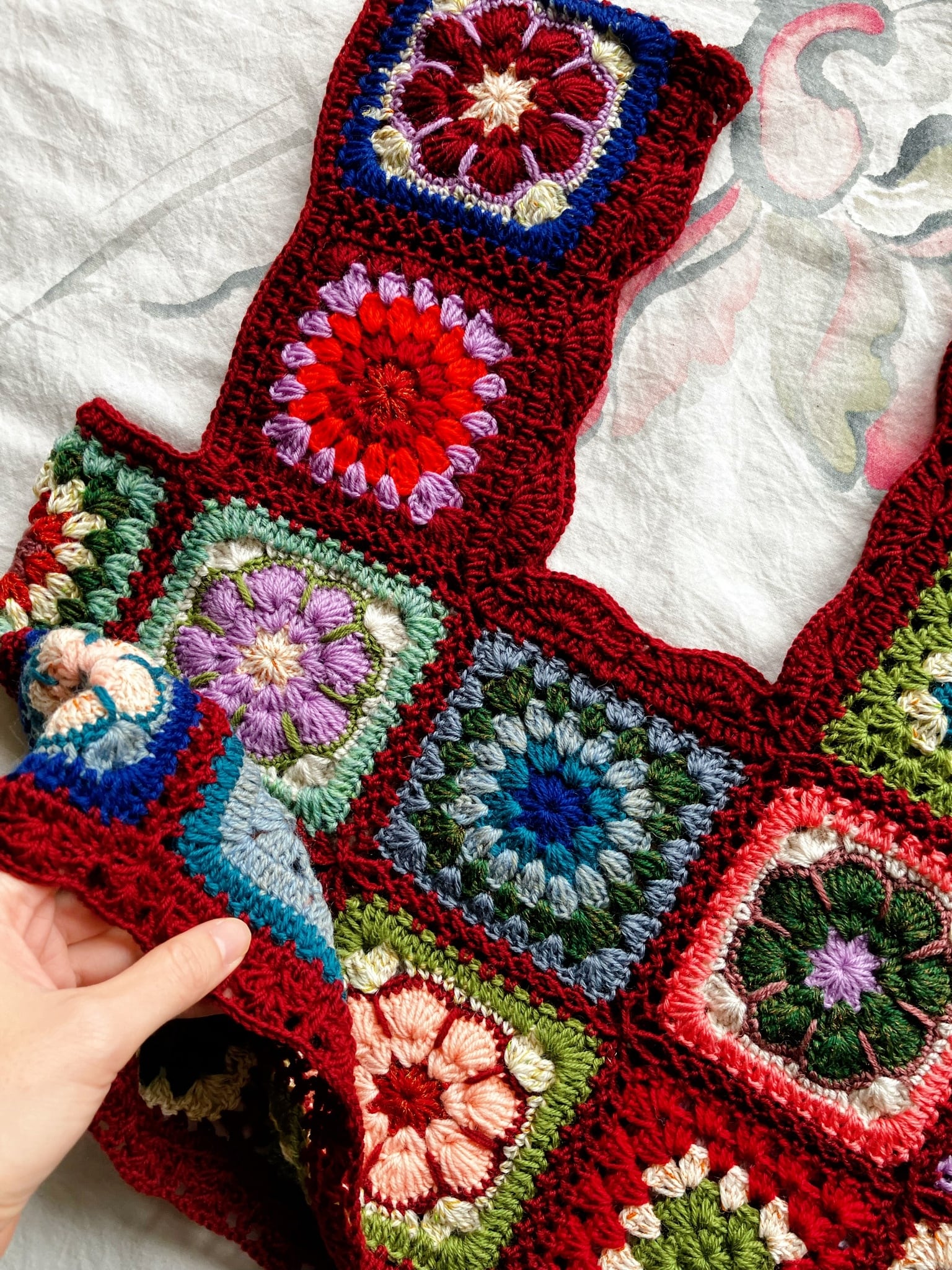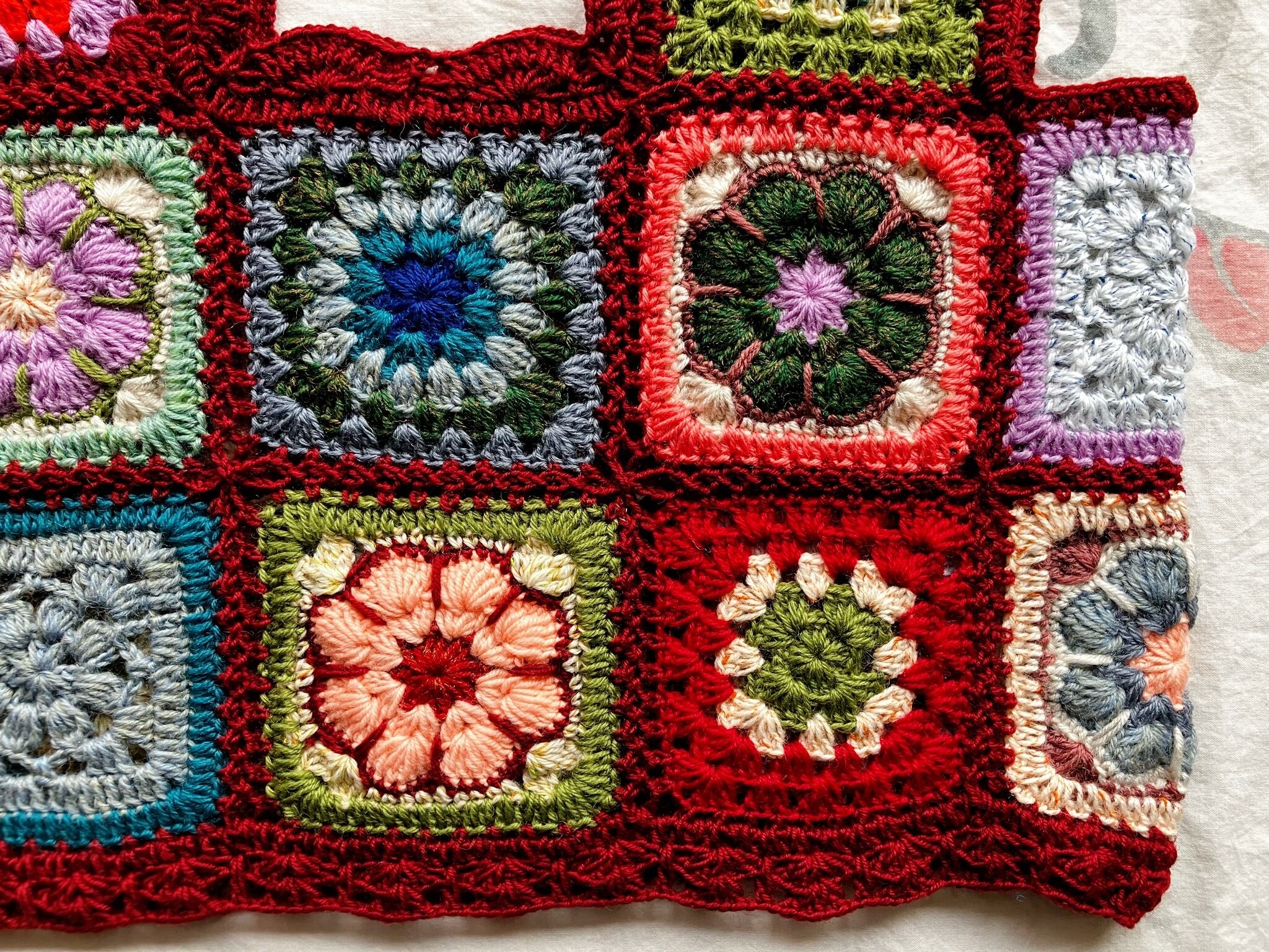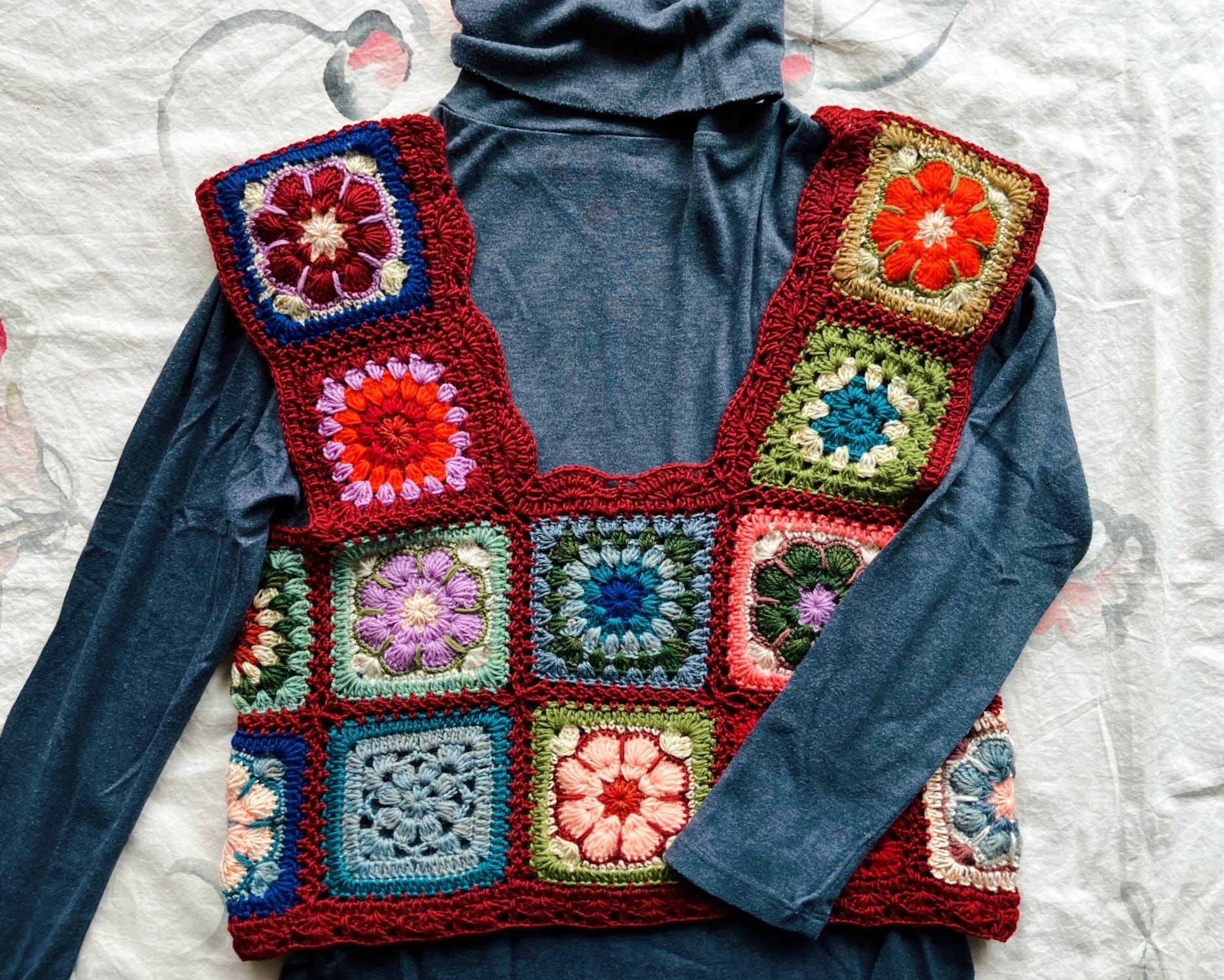 グラニースクエアやアフリカンフラワーなど、数種類の手編みモチーフを組み合わせてオリーブ色の毛糸で繋げたモチーフビスチェです。