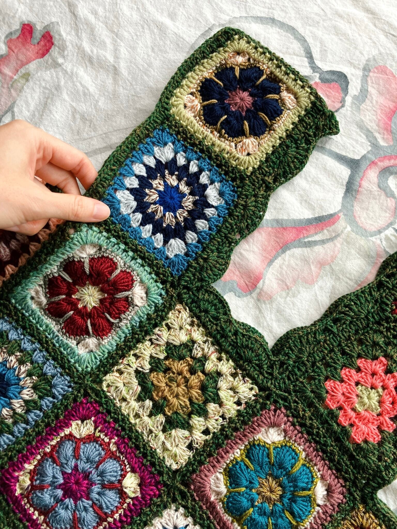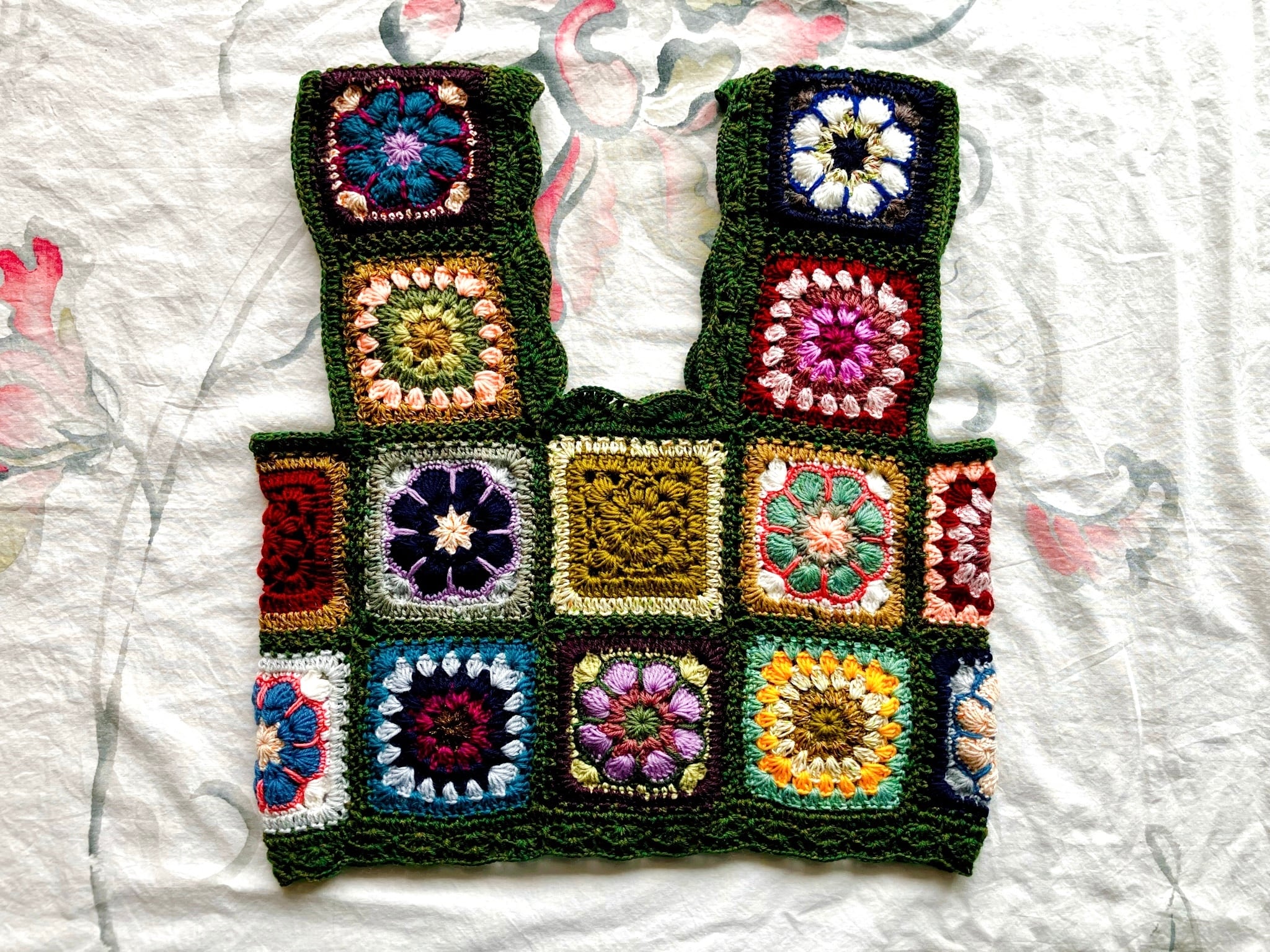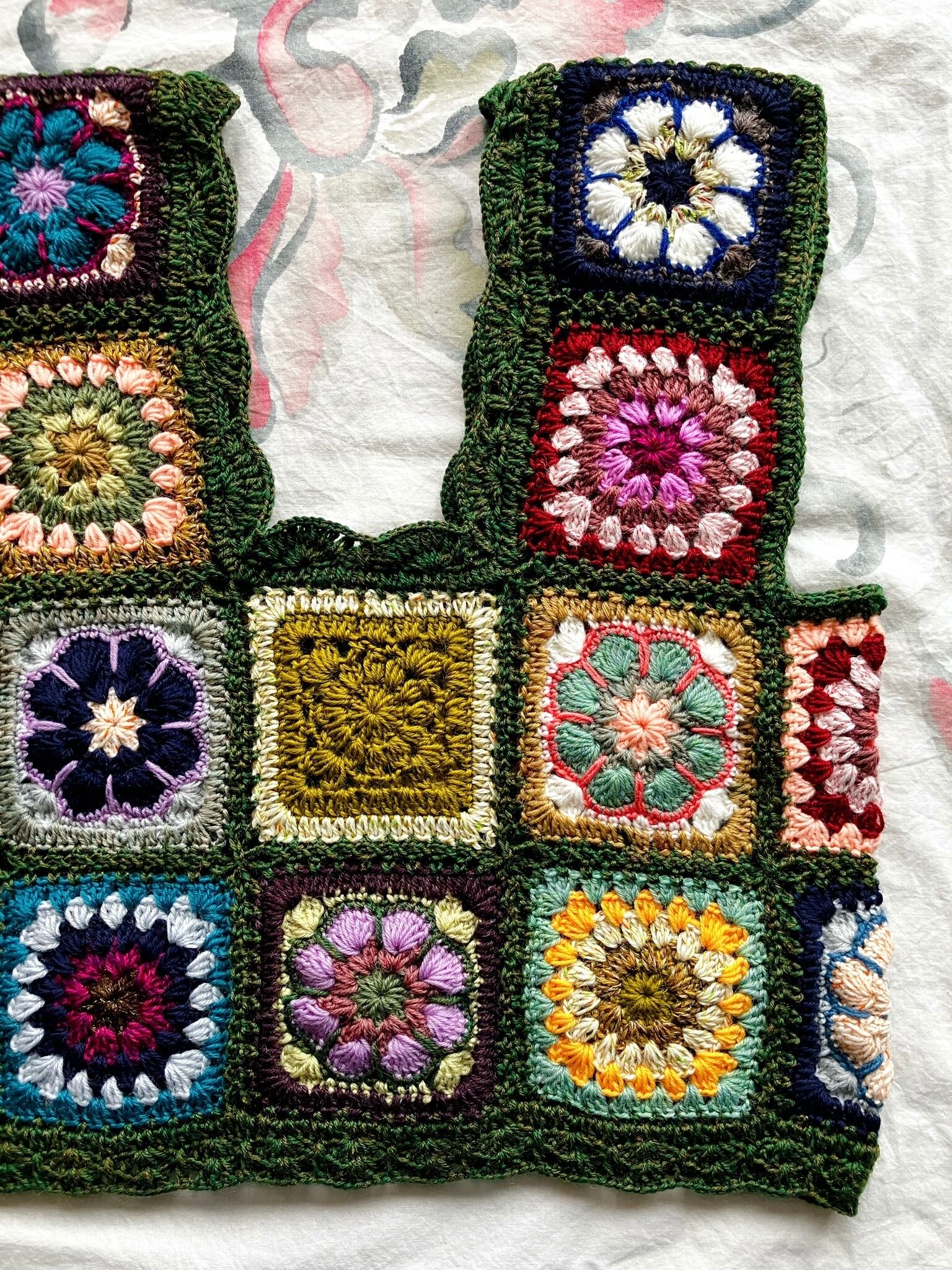グラニースクエアやアフリカンフラワーなど、数種類の手編みモチーフを組み合わせてブロンズが混ざった深緑の毛糸で繋げたモチーフビスチェです。
