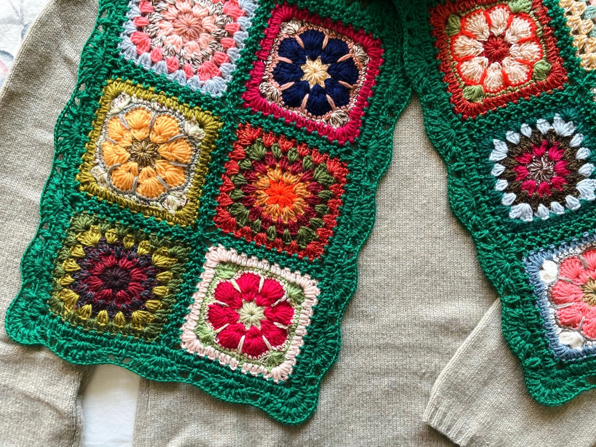 カラフルなモチーフを鮮やかなグリーンの毛糸で繋いで仕上げました。中細ウールで編み上げているためふわっと軽く、秋から春先まで首元を包み込み寒さから守ってくれます。