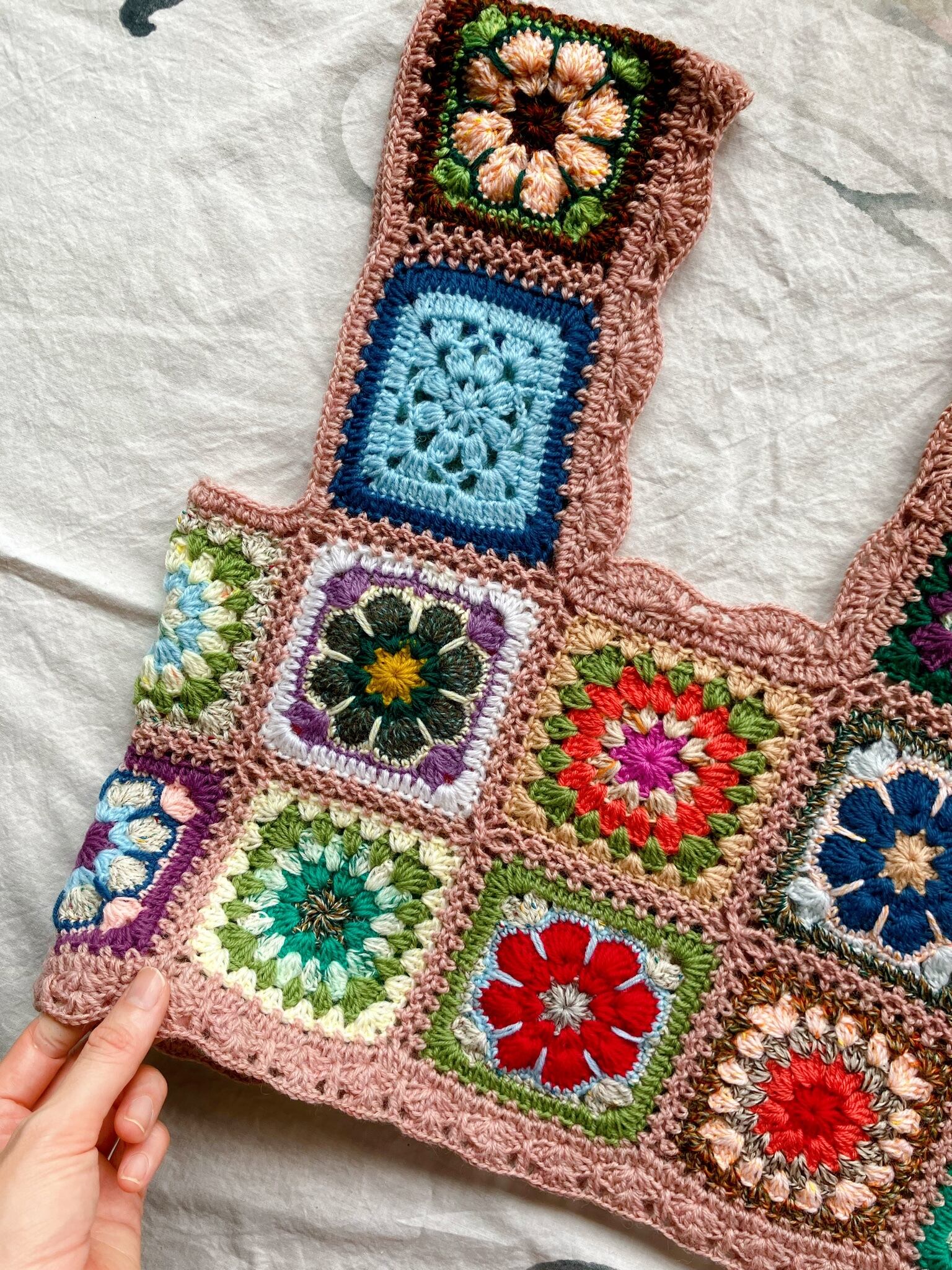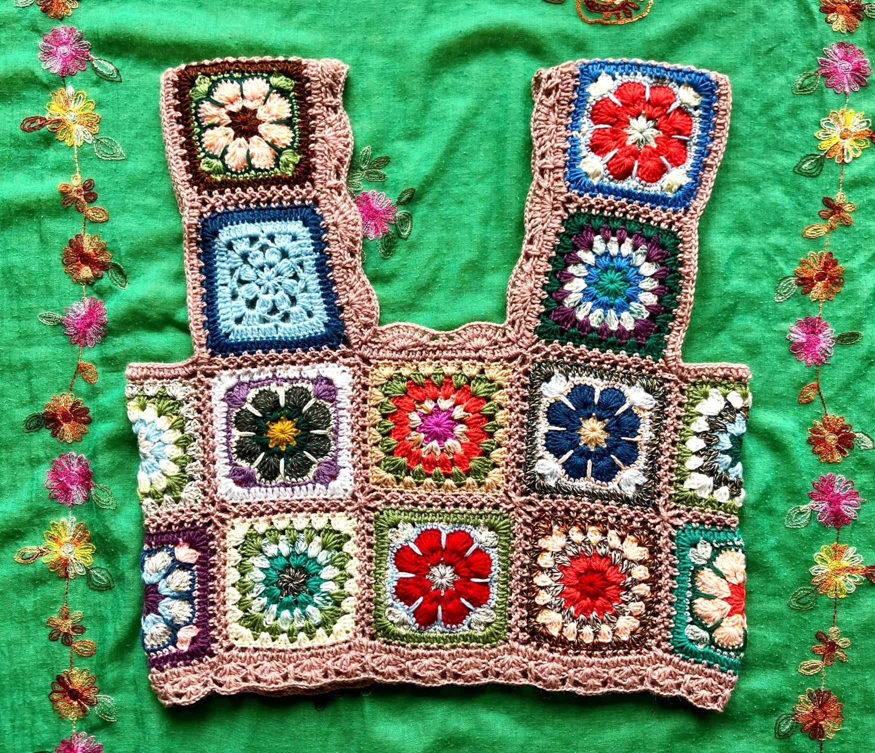 グラニースクエアやアフリカンフラワーなど、数種類の手編みモチーフを組み合わせてピンクベージュの毛糸で繋げたウールビスチェです。
