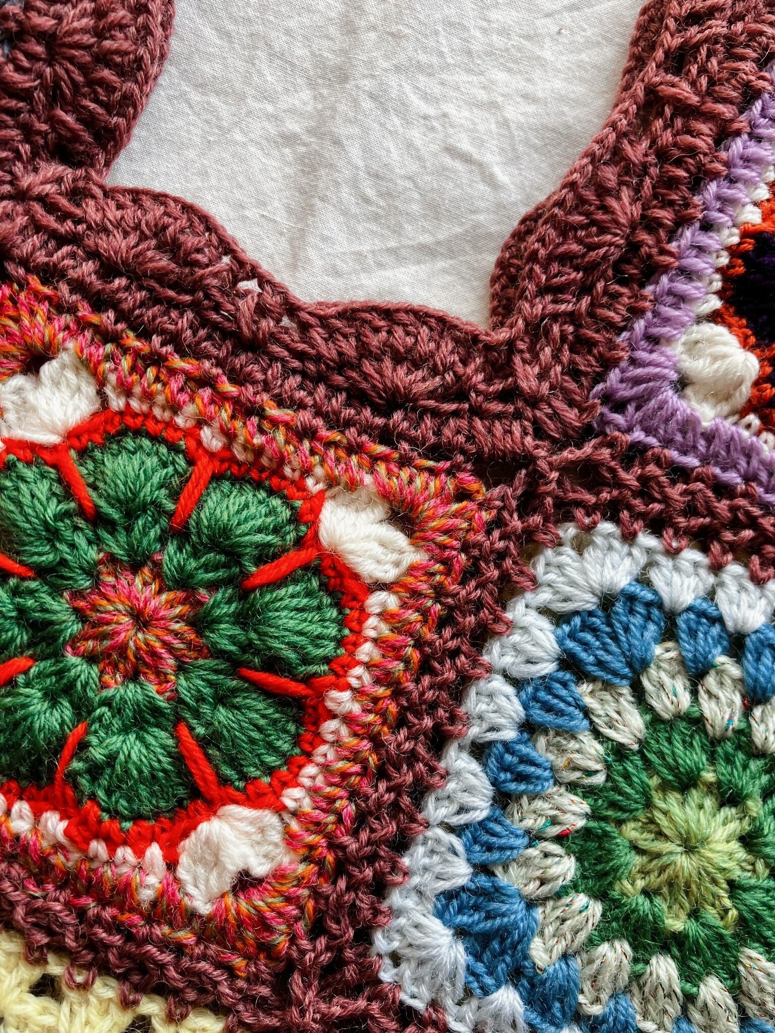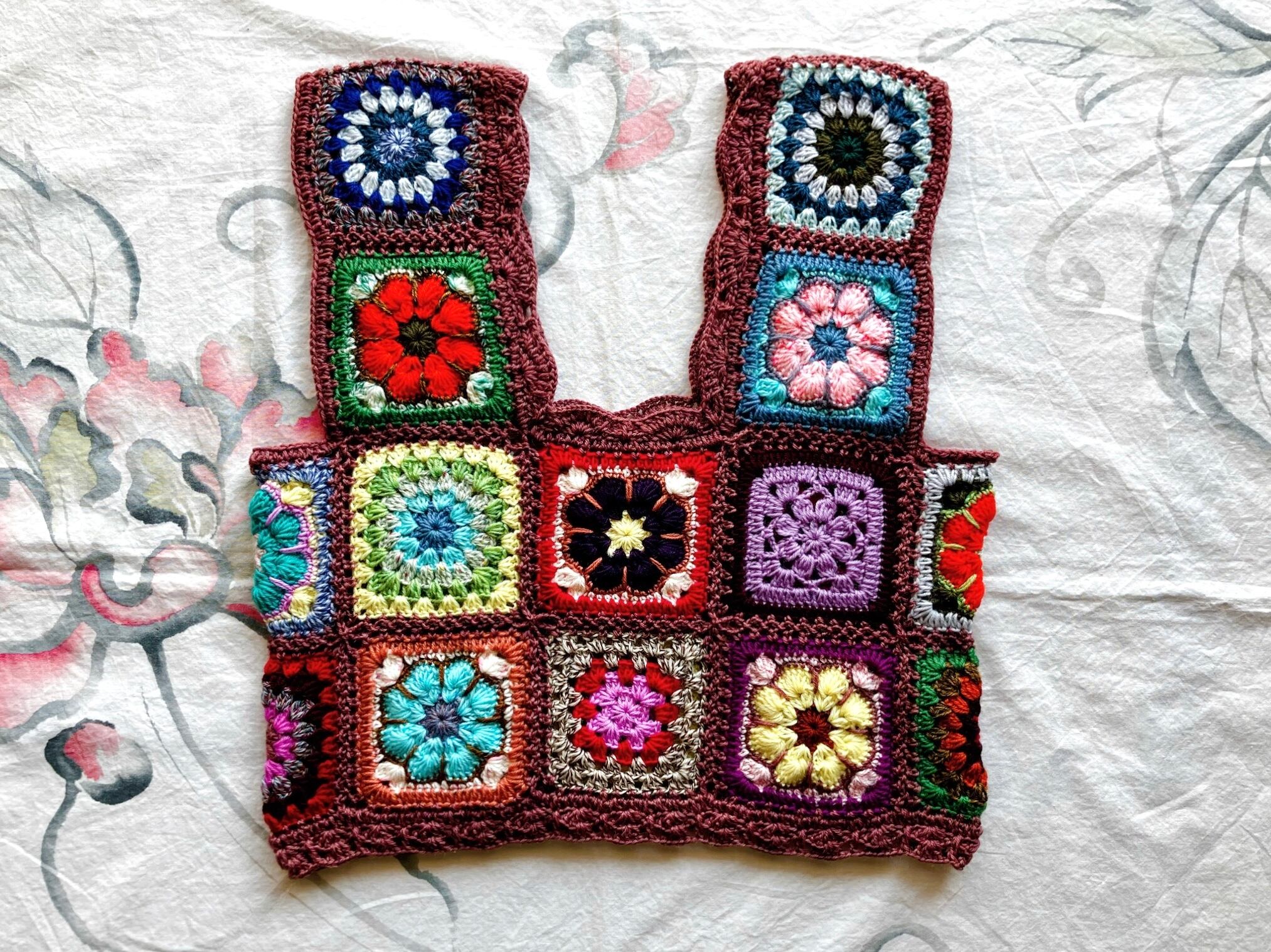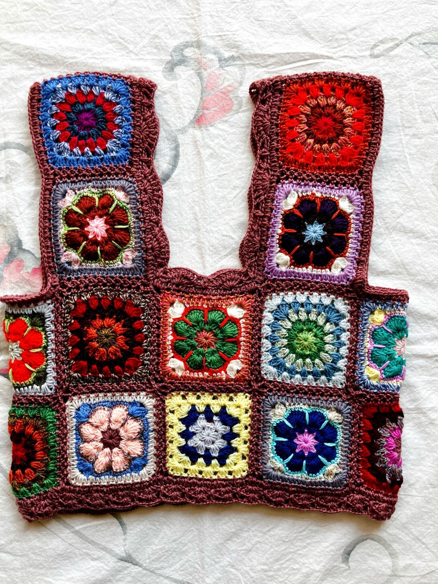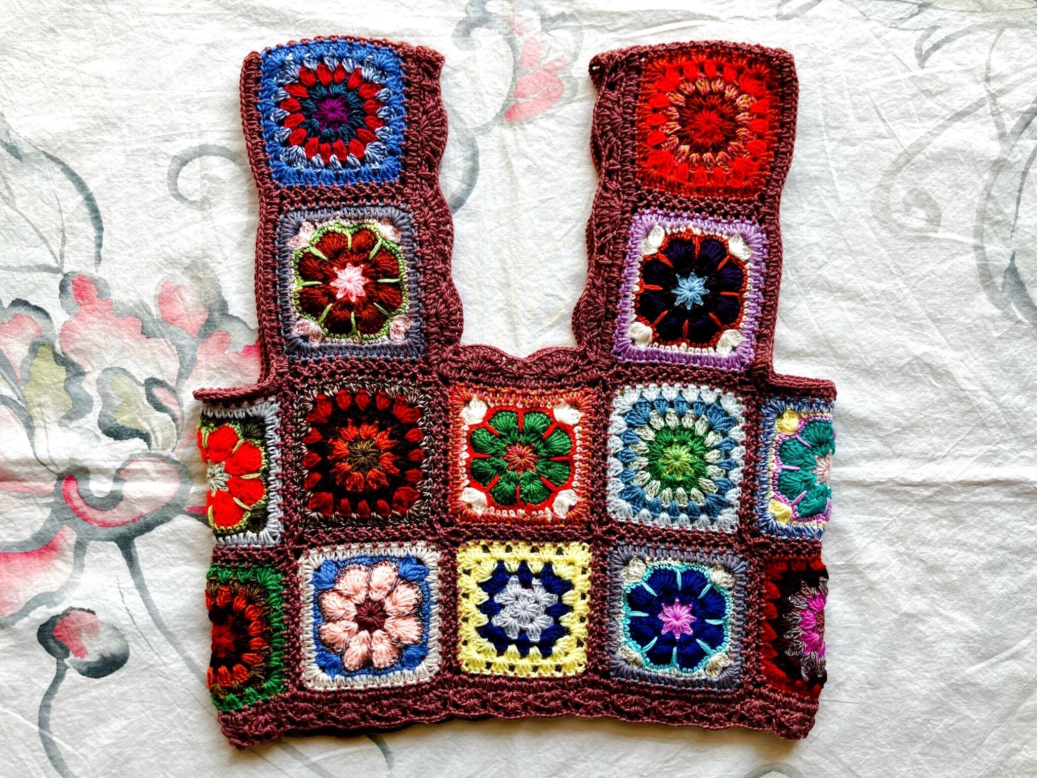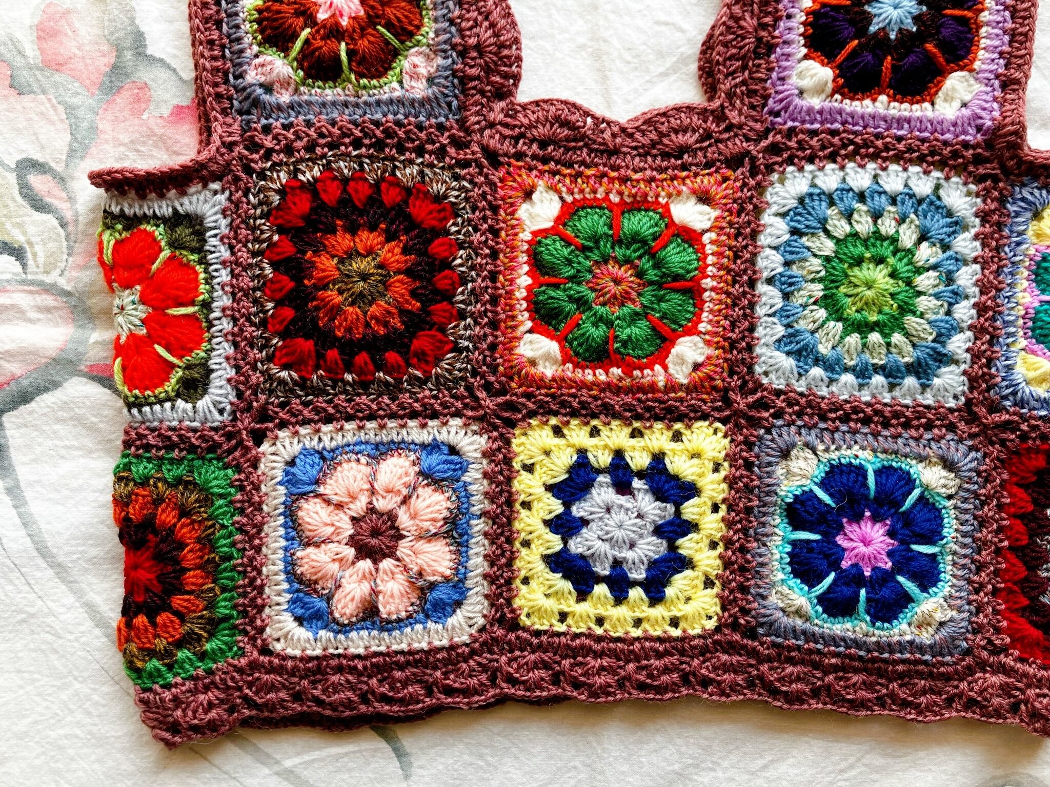 グラニースクエアやアフリカンフラワーなど、数種類の手編みモチーフを組み合わせてモーヴ(くすんだ紫/ピンク系)の毛糸で繋げたウールビスチェです。